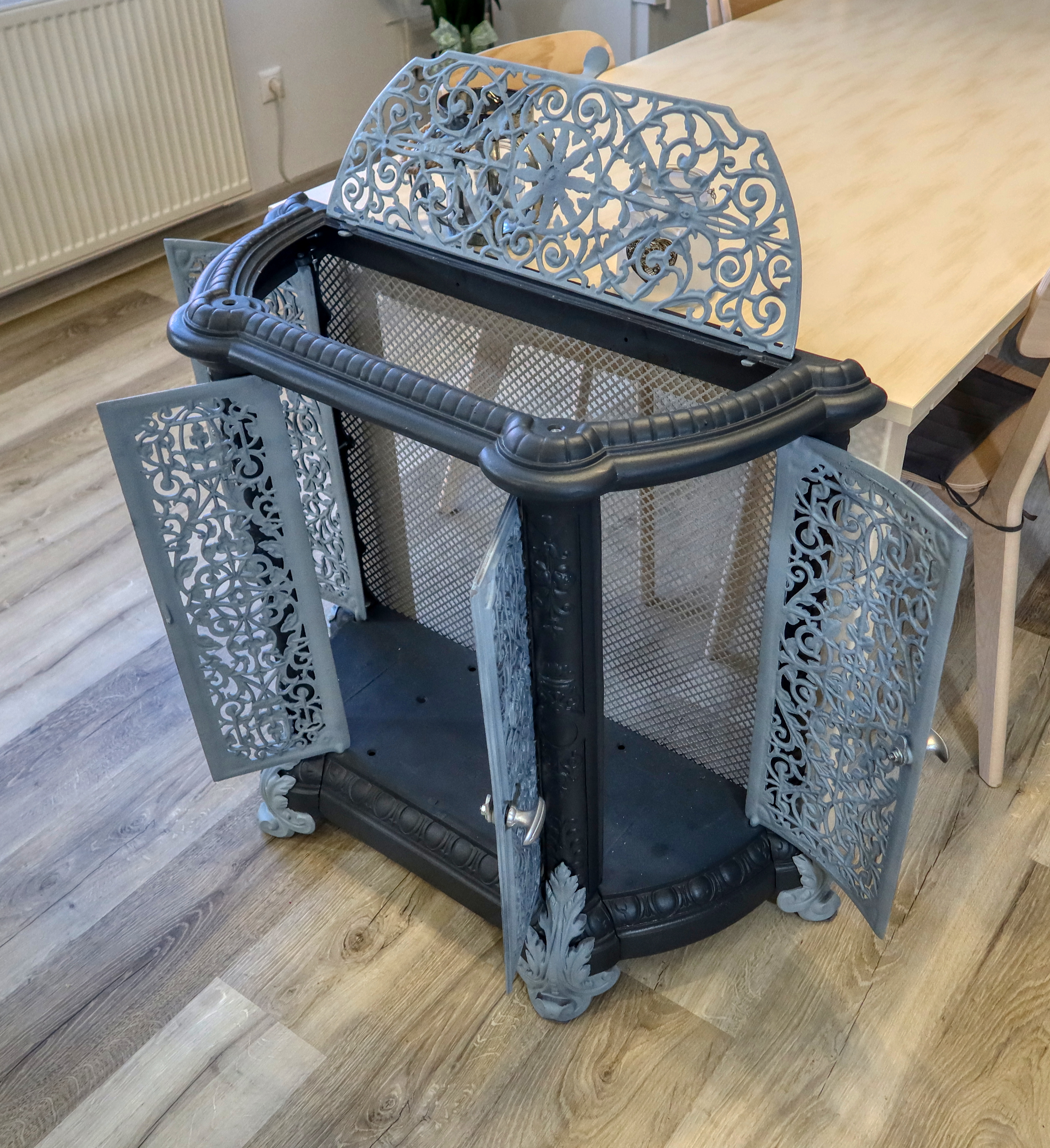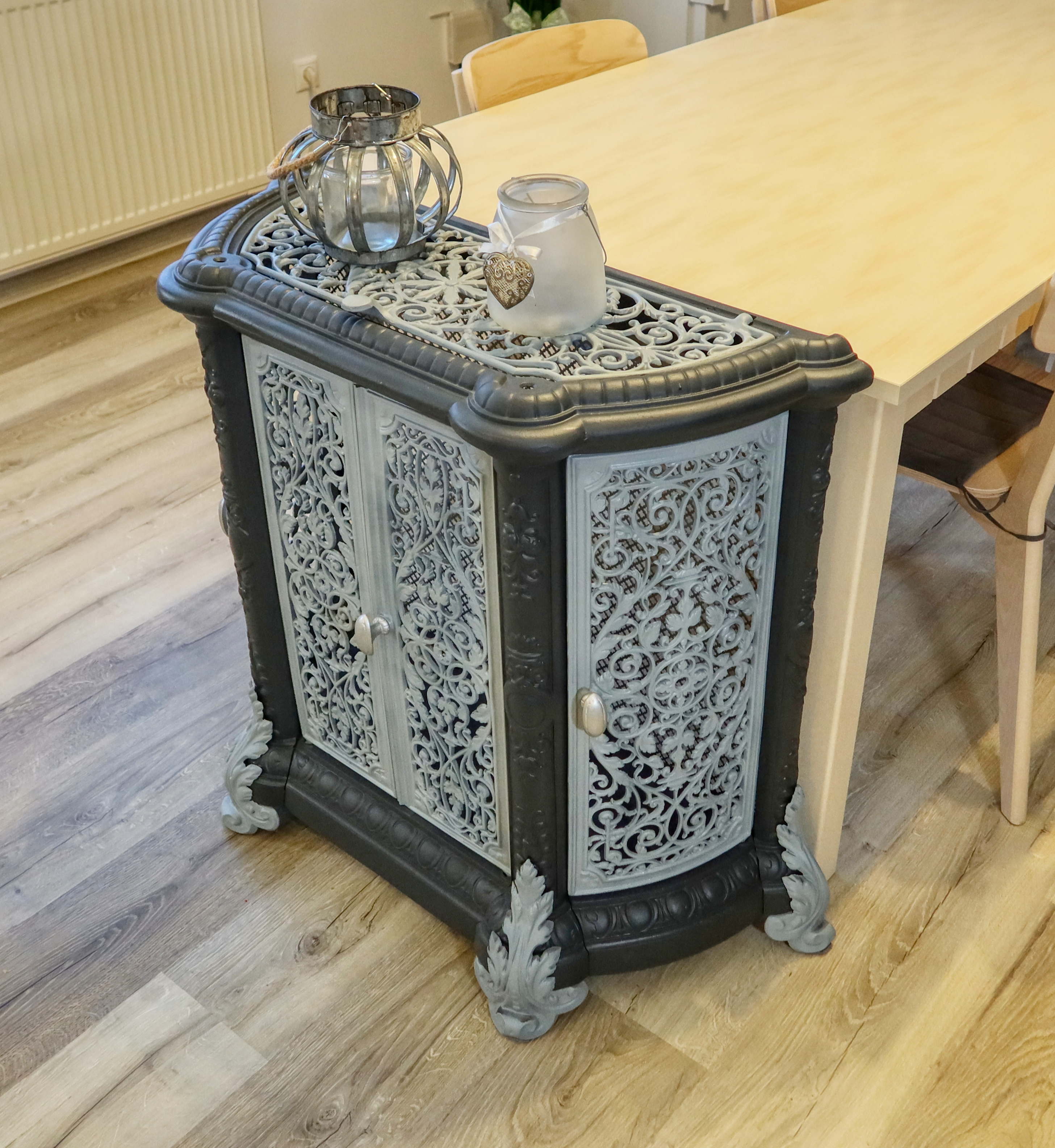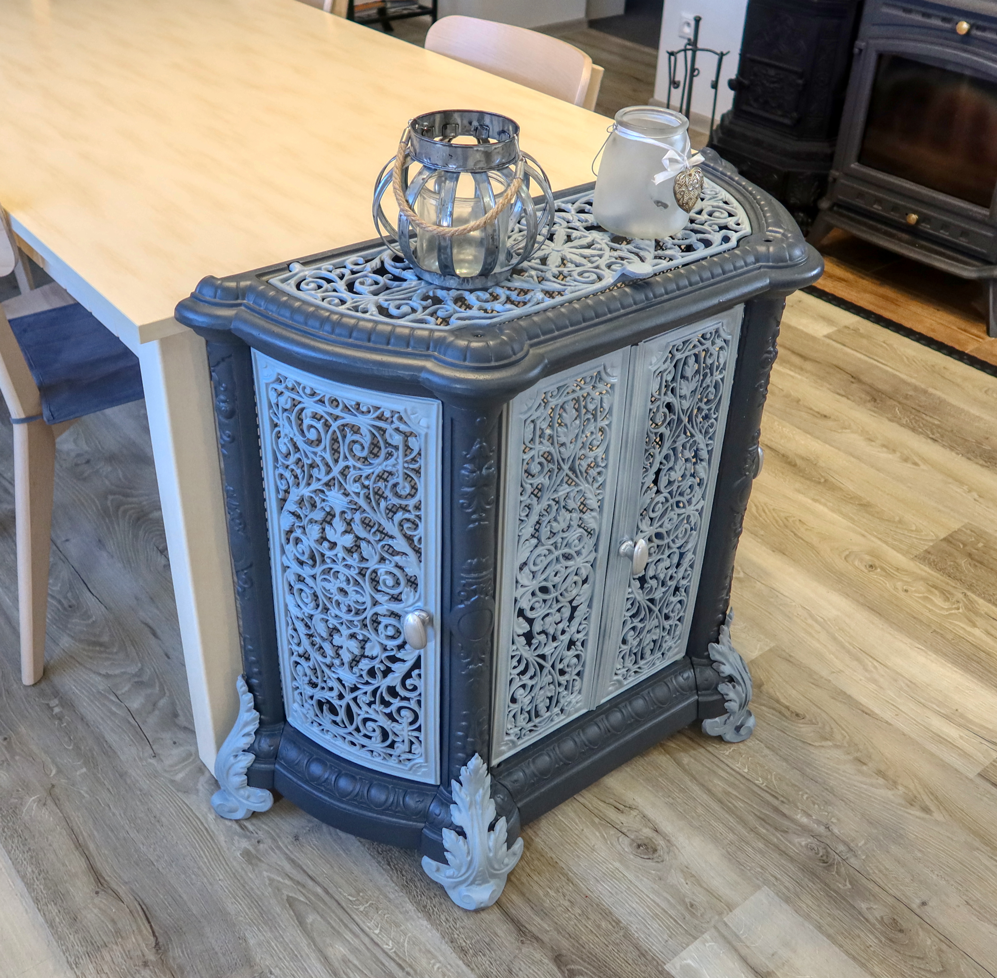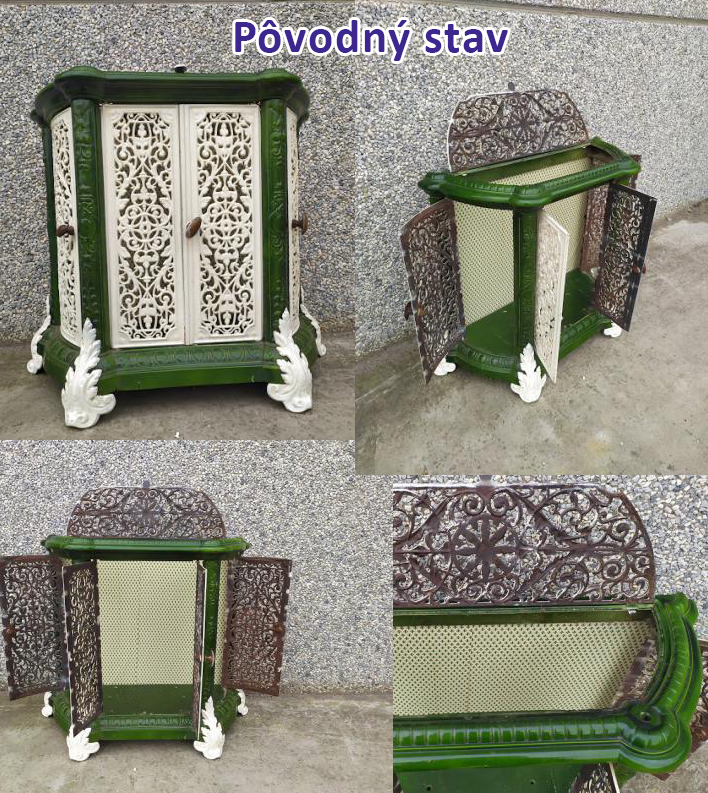 Atypická starožitná komoda, ktorá v minulosti plnila funkciu ochrany a dekorácie vykurovacieho telesa - liatinových krbových kachlí.