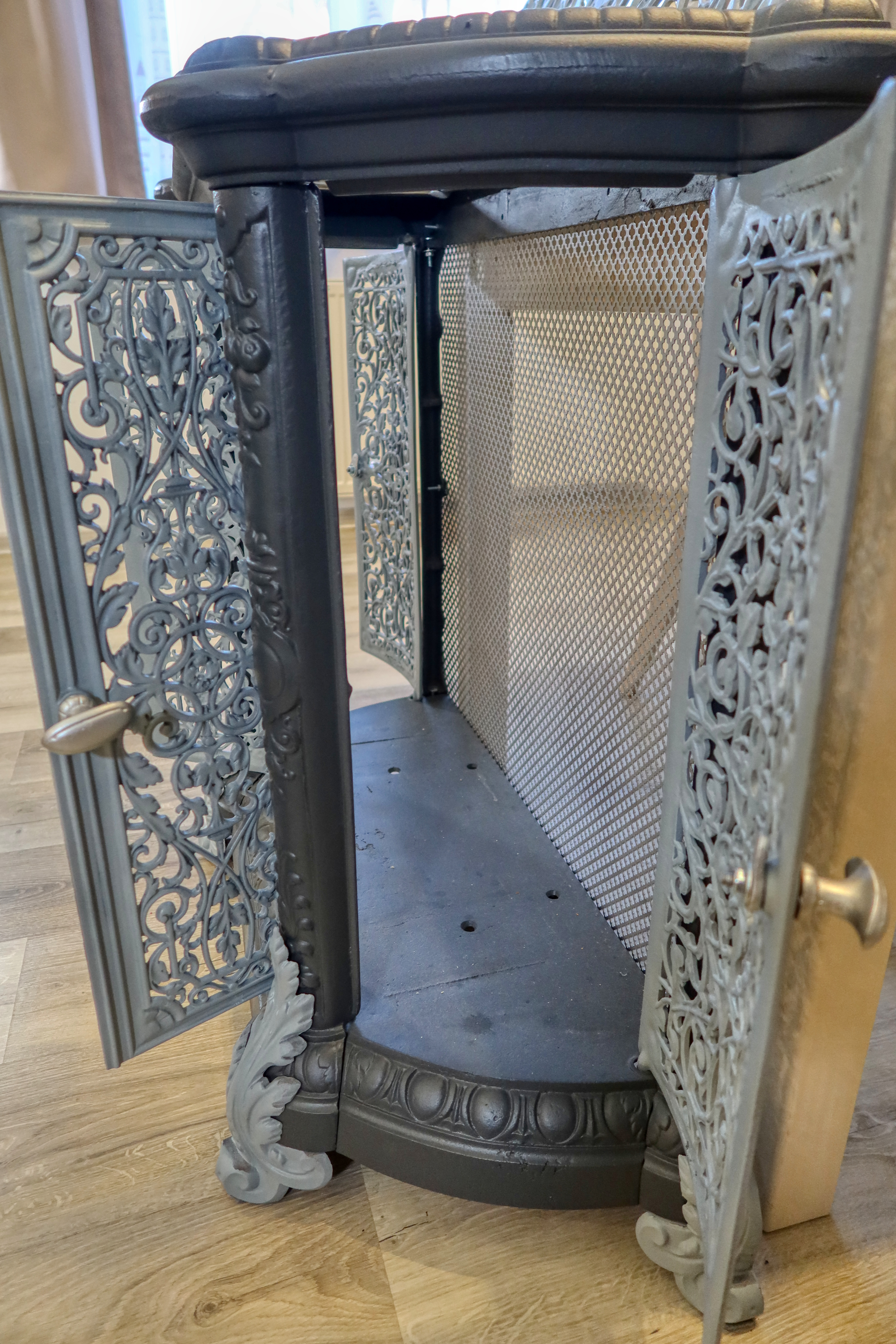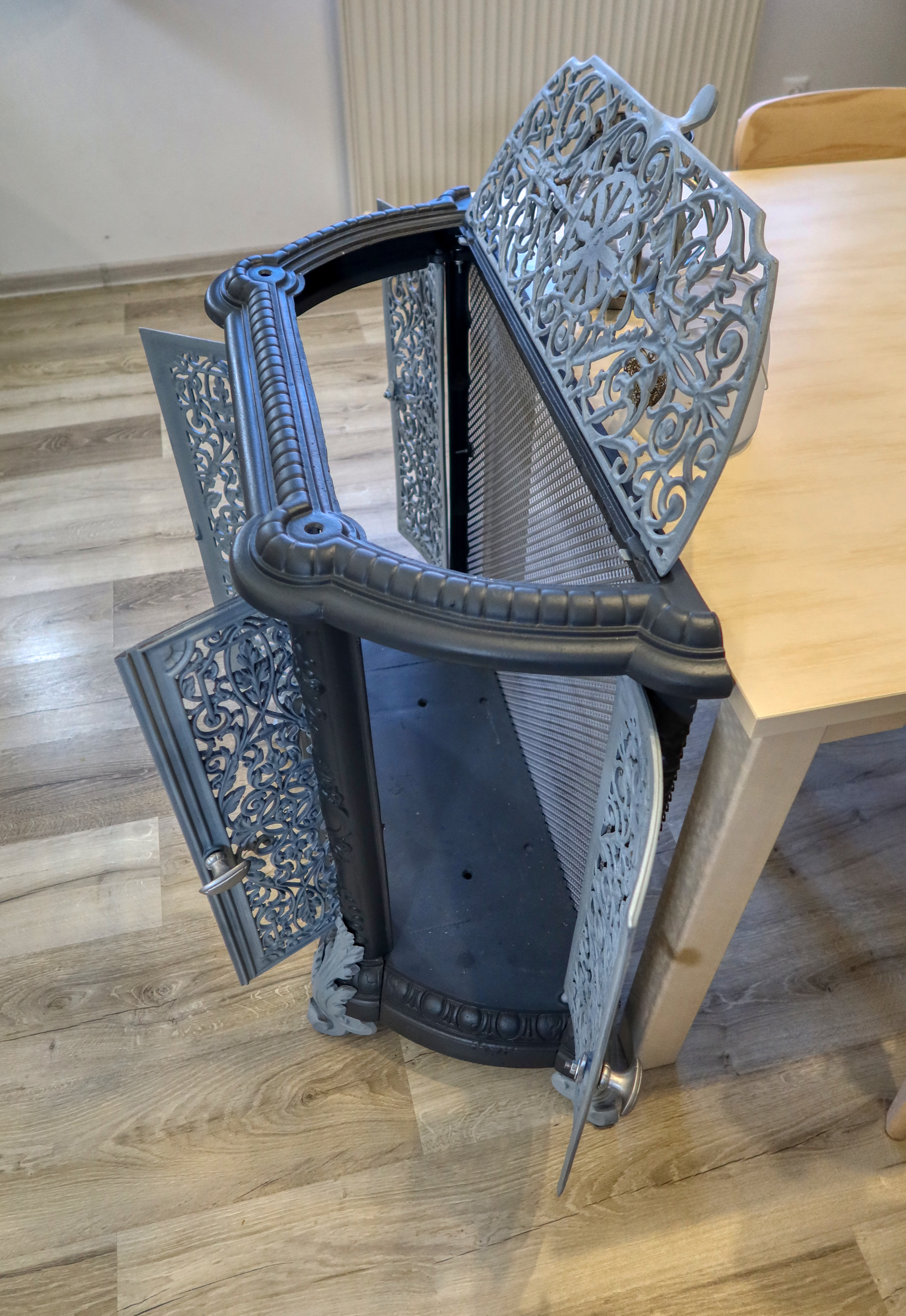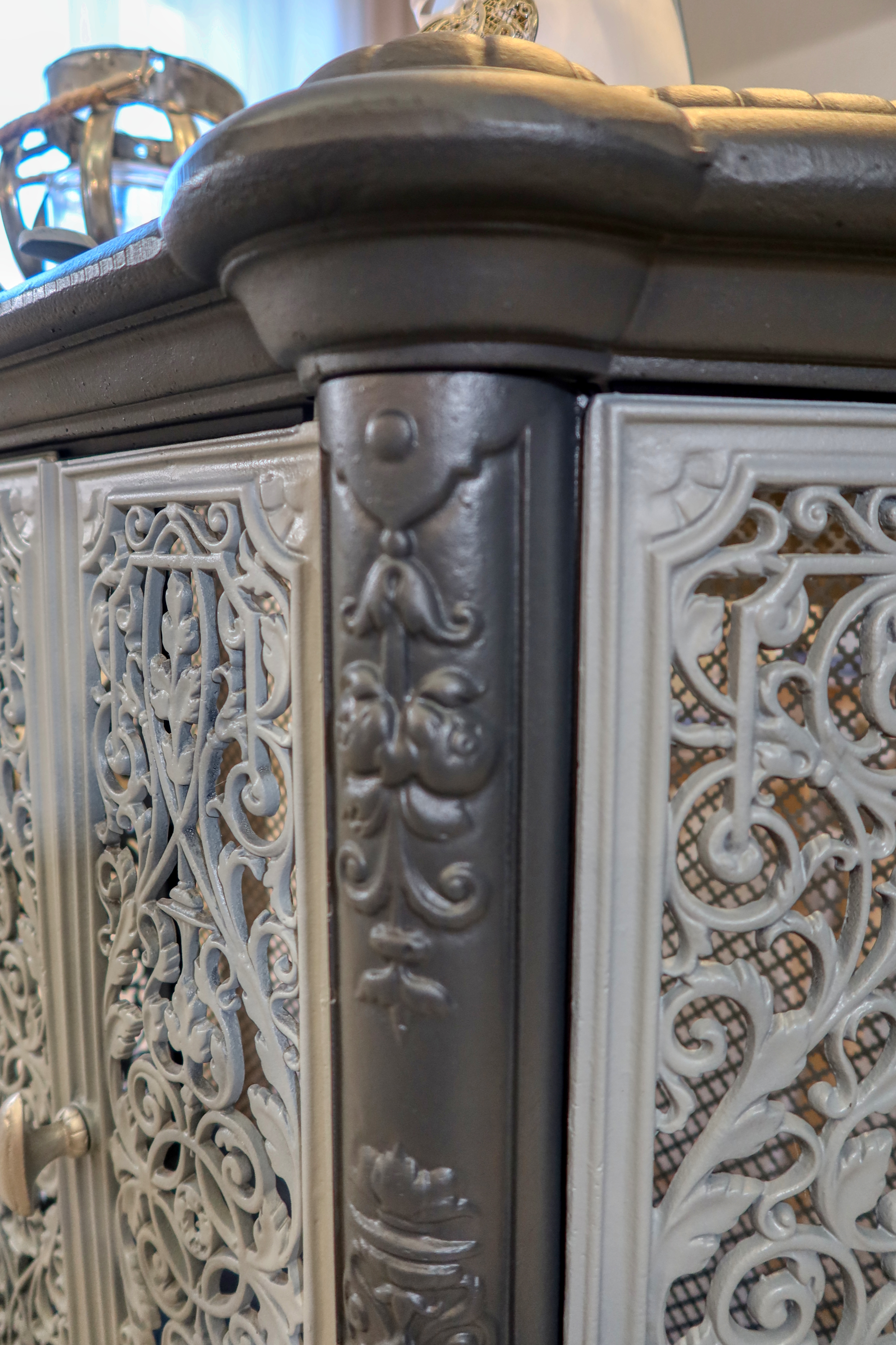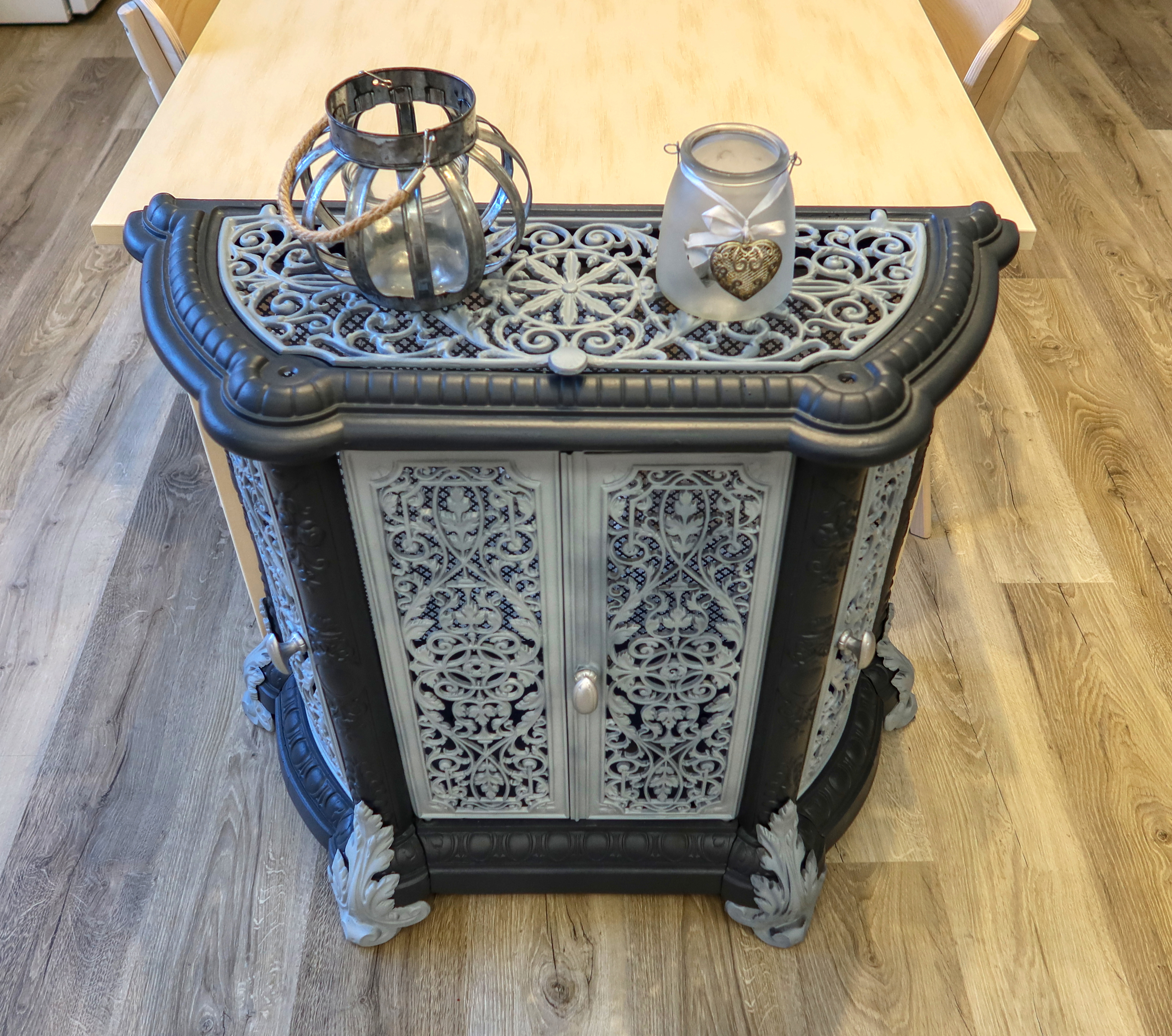 Atypická starožitná komoda, ktorá v minulosti plnila funkciu ochrany a dekorácie vykurovacieho telesa - liatinových krbových kachlí.