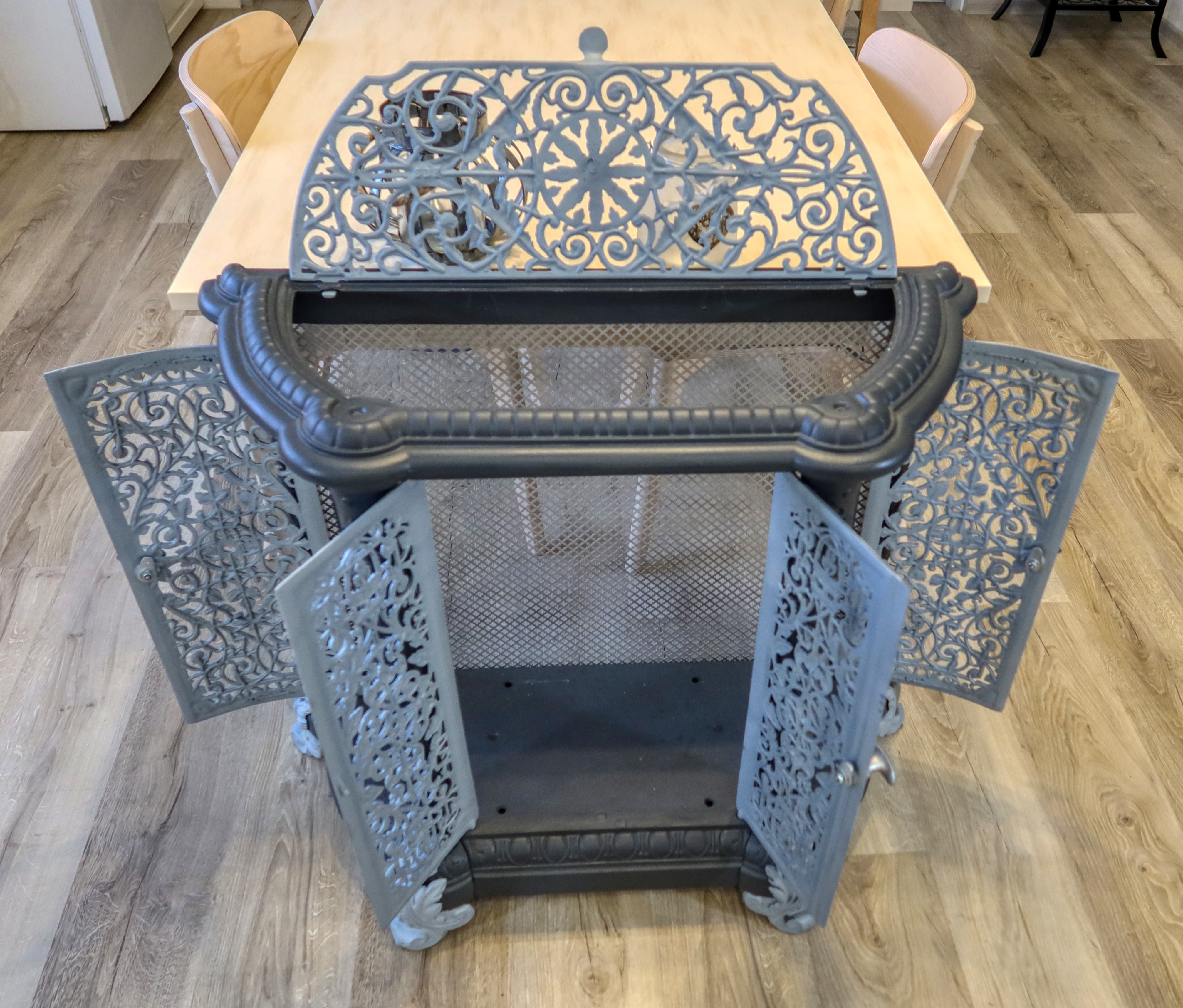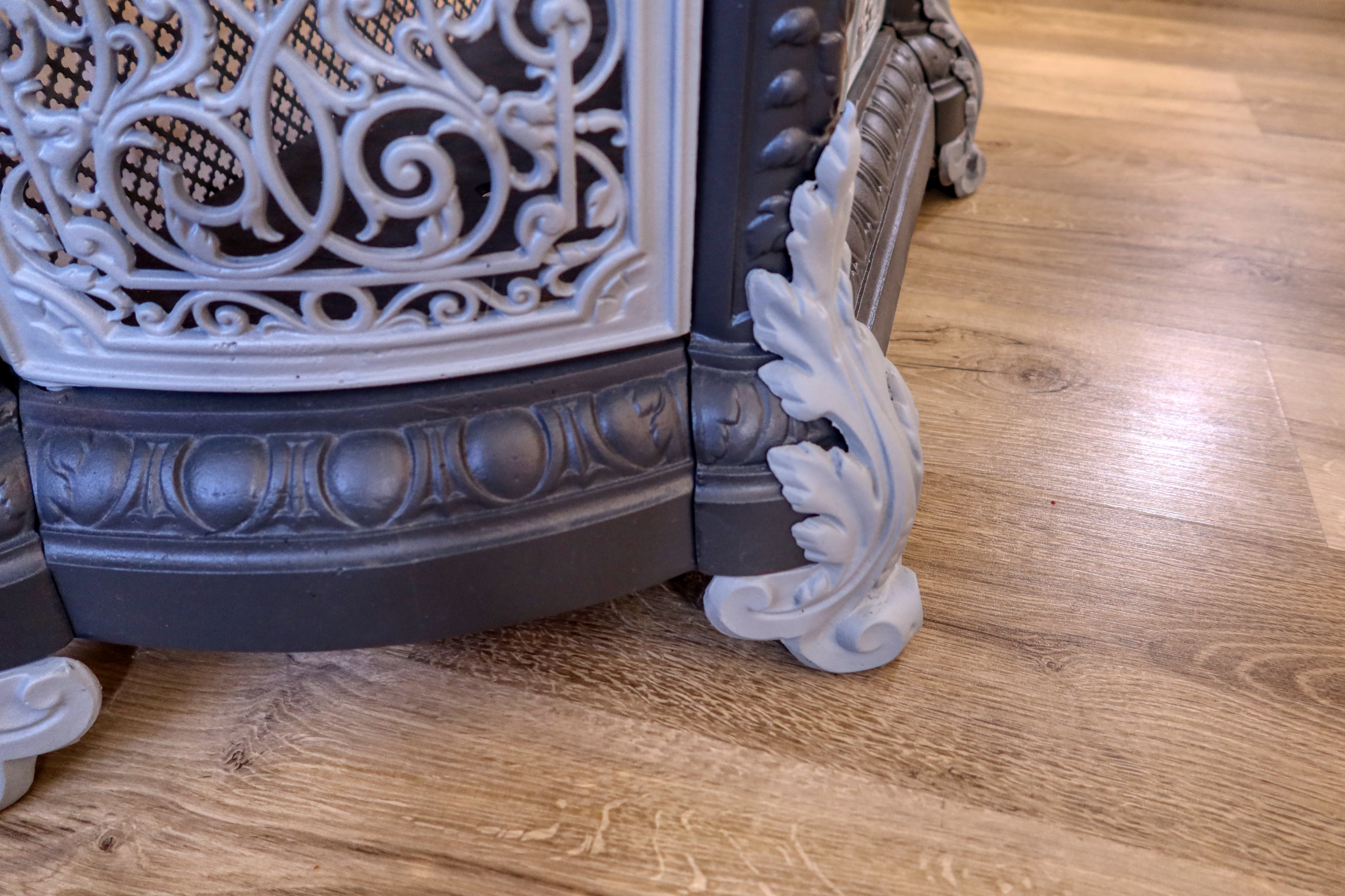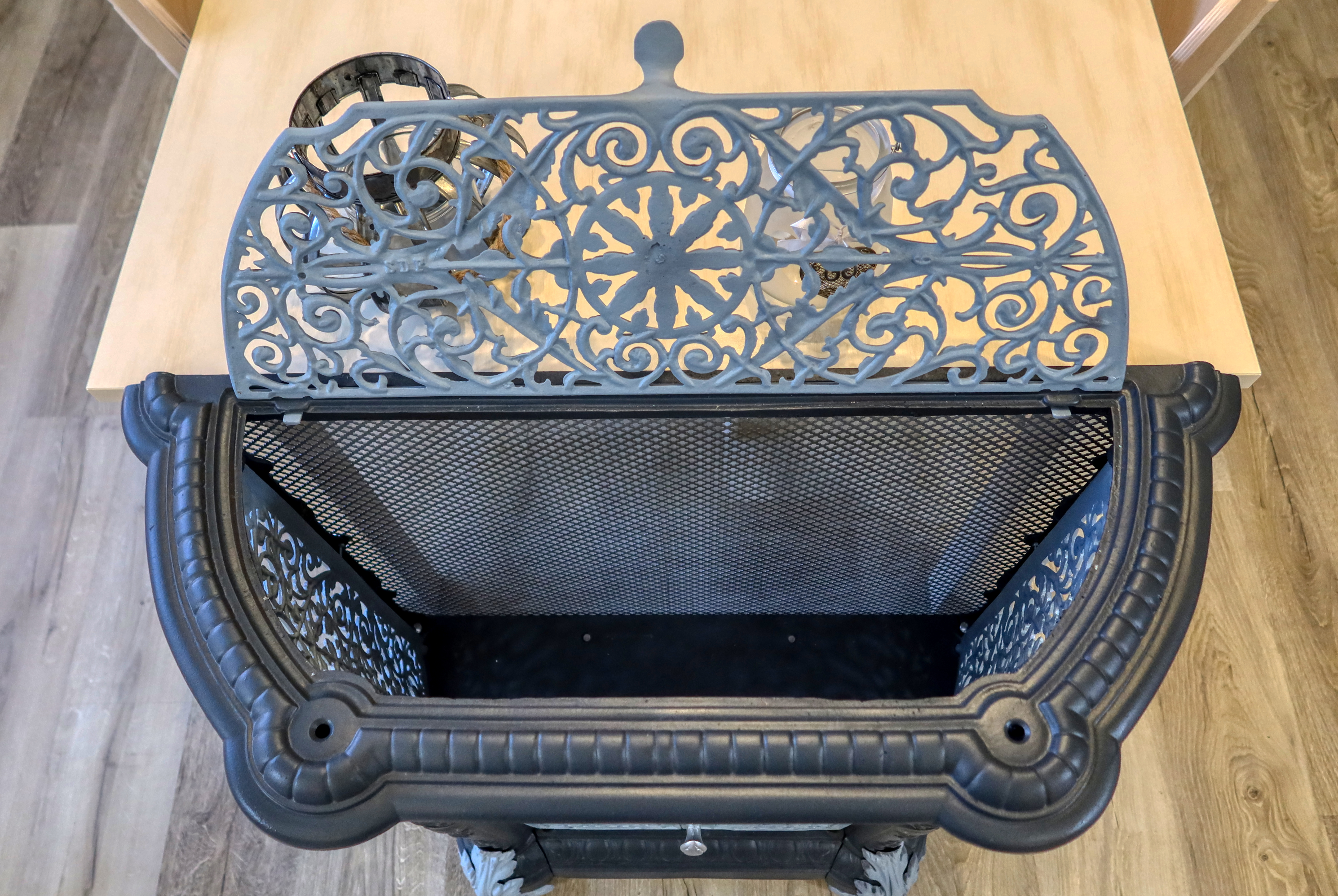 Atypická starožitná komoda, ktorá v minulosti plnila funkciu ochrany a dekorácie vykurovacieho telesa - liatinových krbových kachlí.